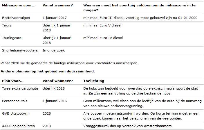 In de pers verschijnen berichten dat de gemeente Amsterdam oude auto's gaat weren in de binnenstad. De milieuzone wordt aangescherpt. Daardoor mogen oudere auto's de binnenstad niet meer in. Het voorgenomen beleid staat in de volgende tabel.