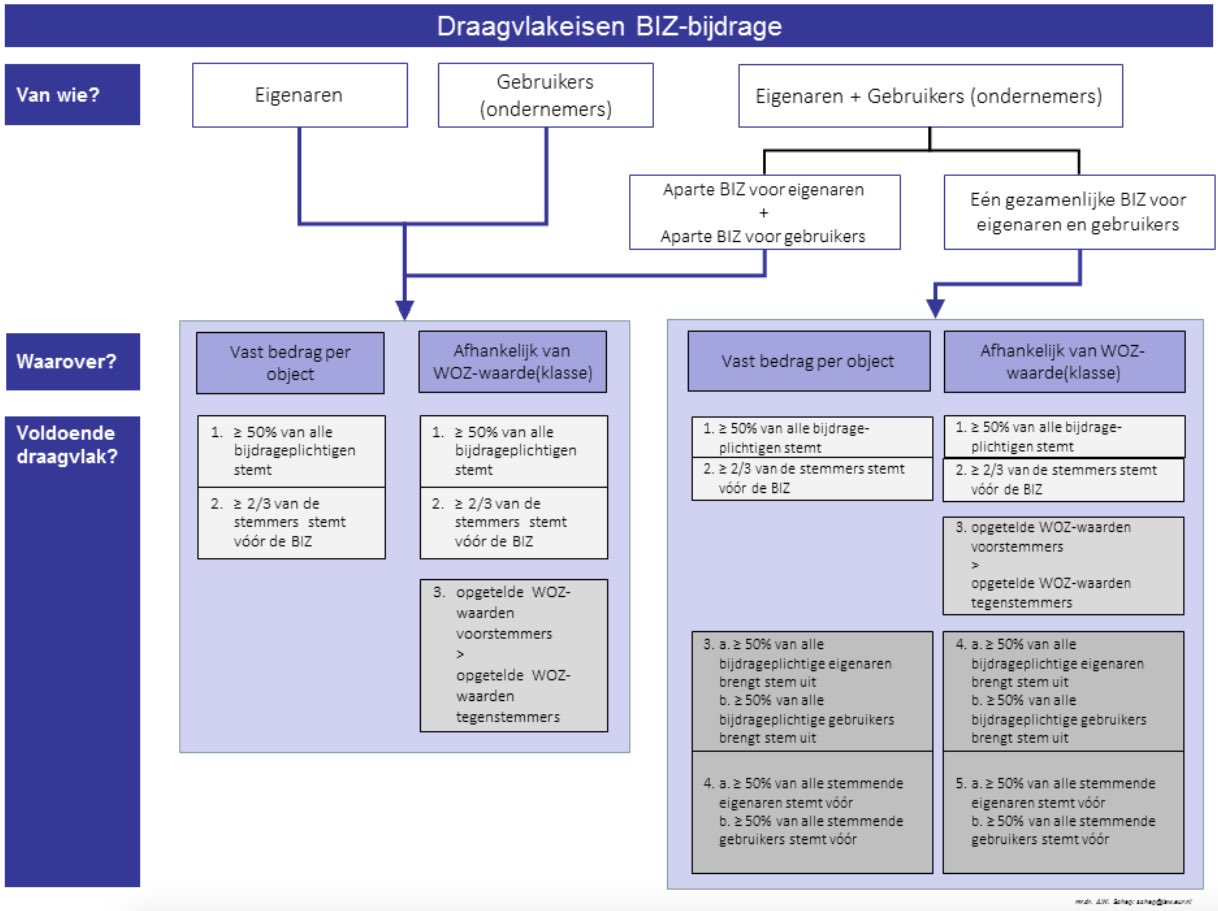 Van de bedrijven in de BIZ moet ten minste 2/3 vóór de inwerking treding van de BIZ zijn. Daarbij moet de som van de WOZ-waarde van de bedrijven die tégen de BIZ zijn, lager zijn dan som van de WOZ-waarden van de bedrijven die vóór zijn. De gemeente Amsterdam heeft in 'Draagvlakeisen BIZ-bijdrage' het volgende overzicht opgenomen: