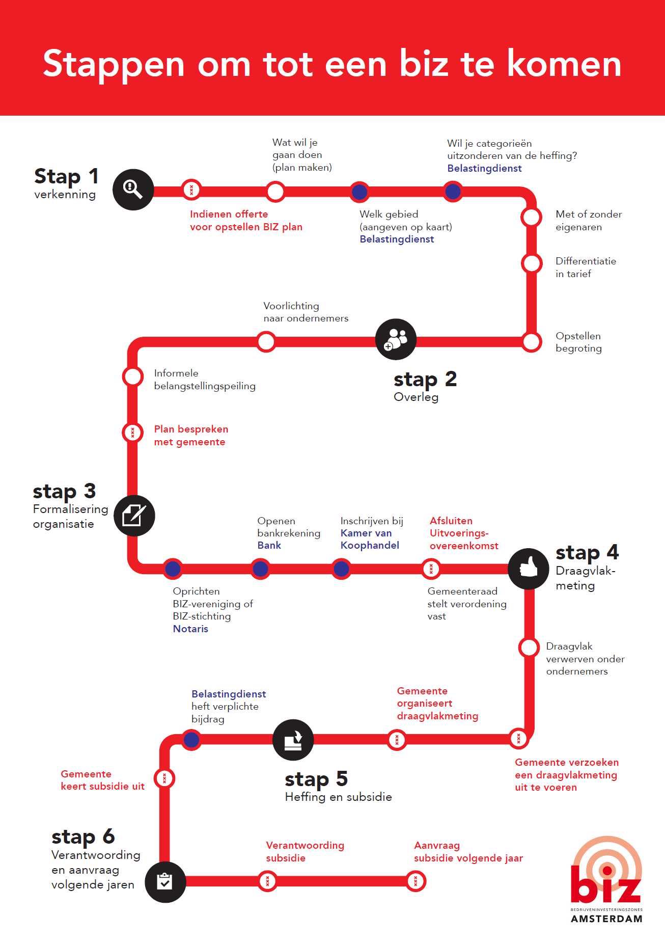 De gemeente Amsterdam heeft ook bovenstaand schematisch stappenplan gemaakt. De stappen daarvan zijn hieronder beschreven. Tevens heeft de gemeente Amsterdam een aantal voorbeelddocumenten gemaakt. Die voorbeelddocumenten kunnen worden gebruikt bij het oprichten en laten 'draaien' van de BIZ. De voorbeelddocumenten zijn met links opgenomen in de volgende beschrijving van het stappenplan.