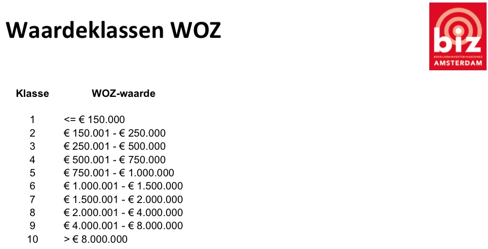 In artikel 1 van de BIZ-wet is geregeld dat de gemeente de BIZ-bijdrage int en dat alle bedrijven (dus niet de woningen)  hier naar rato aan mee moeten betalen. Naar rato wil zeggen, volgens artikel 2, op grond van de Wet waardering onroerende zaken. Met andere woorden: op grond van de WOZ-waarde. Een alternatief voor het naar rato betalen, is dat alle bedrijven hetzelfde bedrag betalen. Dit kunnen de bedrijven samen afspreken.