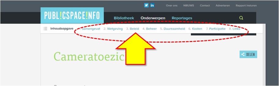 Door op bijvoorbeeld '3. Beleid' te klikken (zie de gele pijl), ga je direct naar de informatie over 'beleid' die bij het betreffende onderwerp hoort. Aan de onderstreping van het woord 'beleid' kun je zien dat je nu hierover aan het lezen bent.