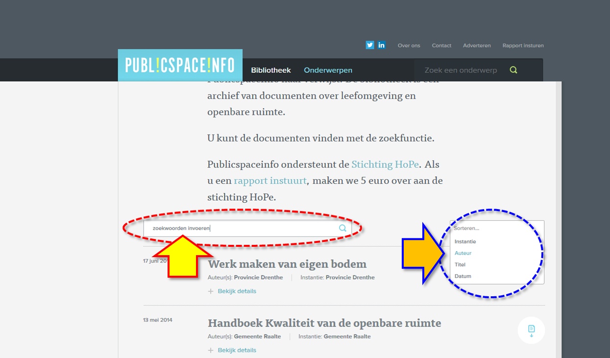 In de bibliotheek kun je alle documenten vinden die op Publicspaceinfo.nl zijn vermeld. De documenten kun je vinden door middel van zoekwoorden of door middel van sorteren.
