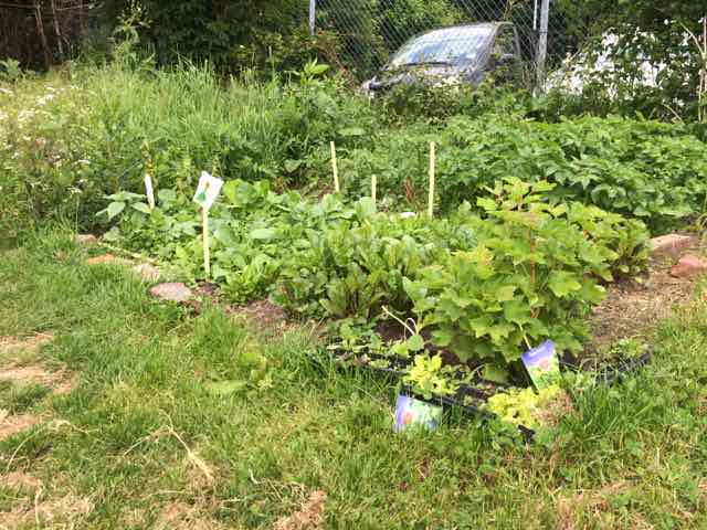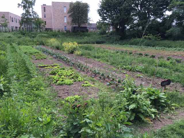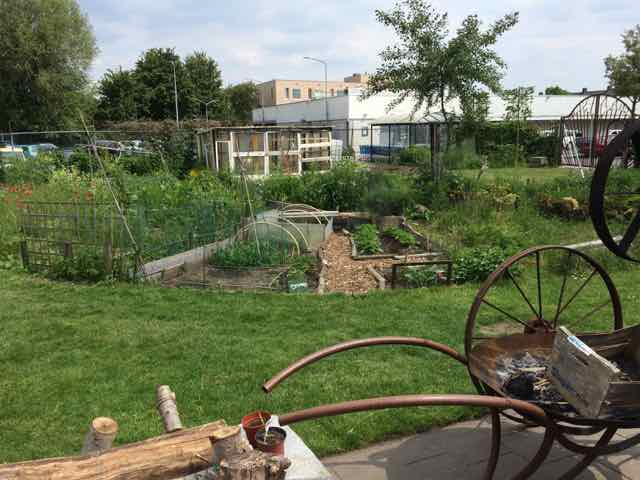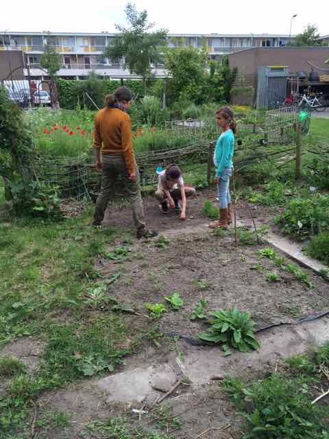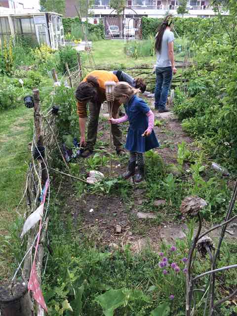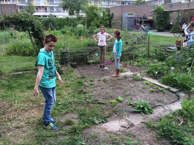 In de achtertuin liggen nogal uiteenlopend ingerichte stukjes grond. Hier hebben kinderen uit de buurt elk hun stukje grond. Niet zo groot, maar genoeg om verschillende groenten te kweken. En ook voldoende om gevoel te krijgen voor waar het om gaat en om te leren dat sla niet uit een fabriek komt.