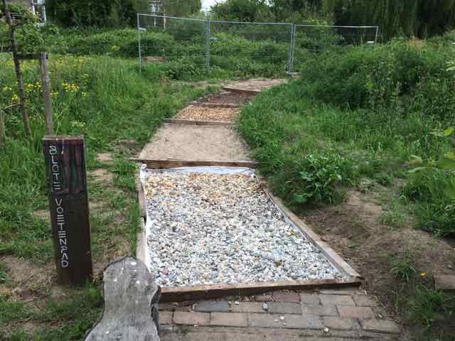 We lopen verder en zien het kerstbomen-asiel. Daar kunnen mensen hun kerstboom met kluit brengen. Tegen de kerst kan hun boom weer worden opgehaald door ze. Er is een kruidentuintje. Eventje verder zien we het 'blote voeten pad'. "Hier kunnen mensen ervaren welke ondergronden er zijn. Denk aan grind, turf, houtvezels, modder, stro. Eigenlijk voel je dat nooit meer. Je loopt altijd op schoenen. Hier willen we dat contact met de aarde letterlijk maken" vertelt Albert.