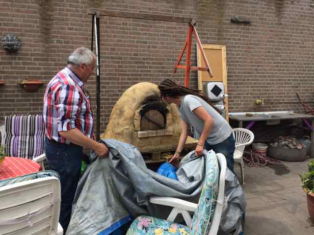 Ondertussen wordt de pizza-oven onder het zeil vandaan gehaald. De oven is door een buurtbewoner gebouwd van natuurlijke materialen. De oven wordt, met mooi weer zoals vandaag (!), opgestookt om pizza's te maken met daarop de eigen gekweekte groente.